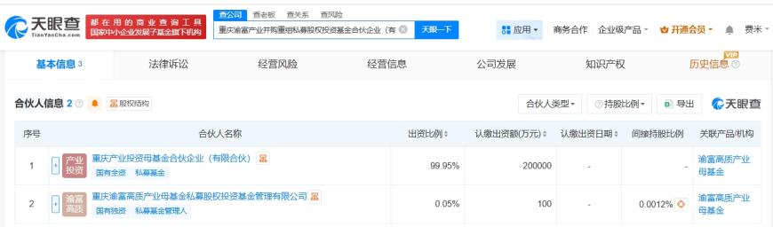 天眼查显示,近日,重庆渝富产业并购重组私募股权投资基金合伙企业(有限合伙)成立,执行事务合伙人为重庆渝富高质产业母基金私募股权投资基金管理有限公司,出资额20.01亿人民币,经营范围为以私募基金从事股权投资,由重庆产业投资母基金合伙企业(有限合伙)、重庆渝富高质产业母基金私募股权投资基金管理有限公司共同出资。