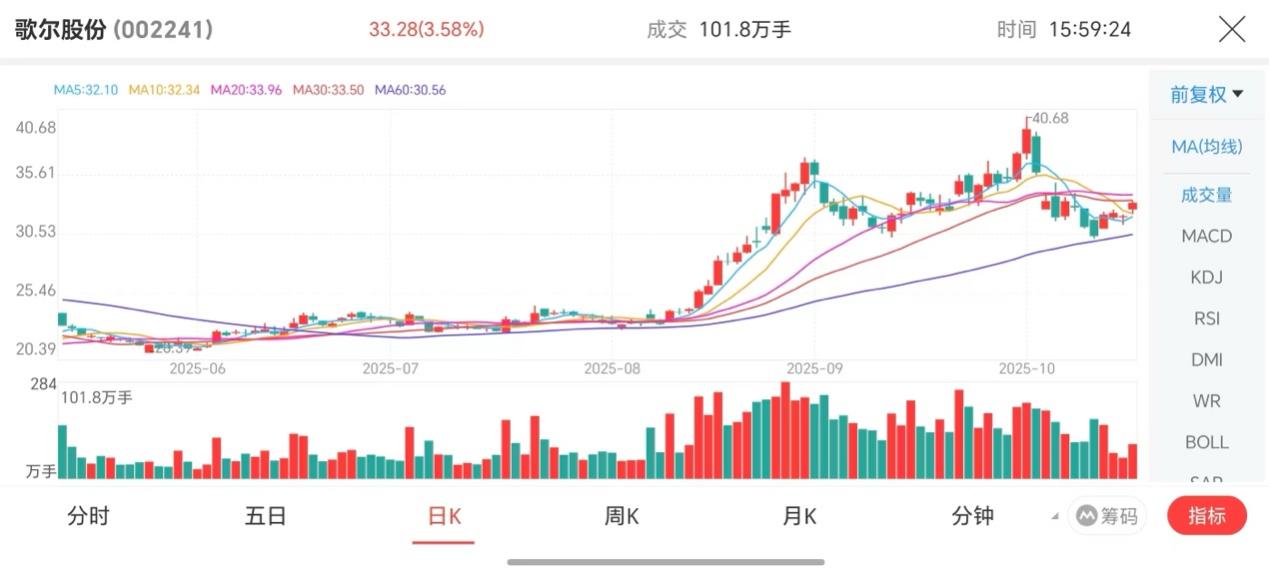 公司的稳健发展和成长潜力也赢得了资本市场的认可。二级市场上,歌尔股份股价在三季度表现强势,最高涨至40.68元/股,创下阶段性新高,年内最大区间涨幅接近140%。