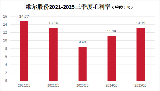 经营质量方面,第三季度歌尔股份毛利率提升至13.19%,较2024年同期提升1.75个百分点,且近年来持续改善。这一数据变化,直观反映出公司产品结构优化的成效持续显现,高附加值产品占比提升,进一步夯实了盈利基础。